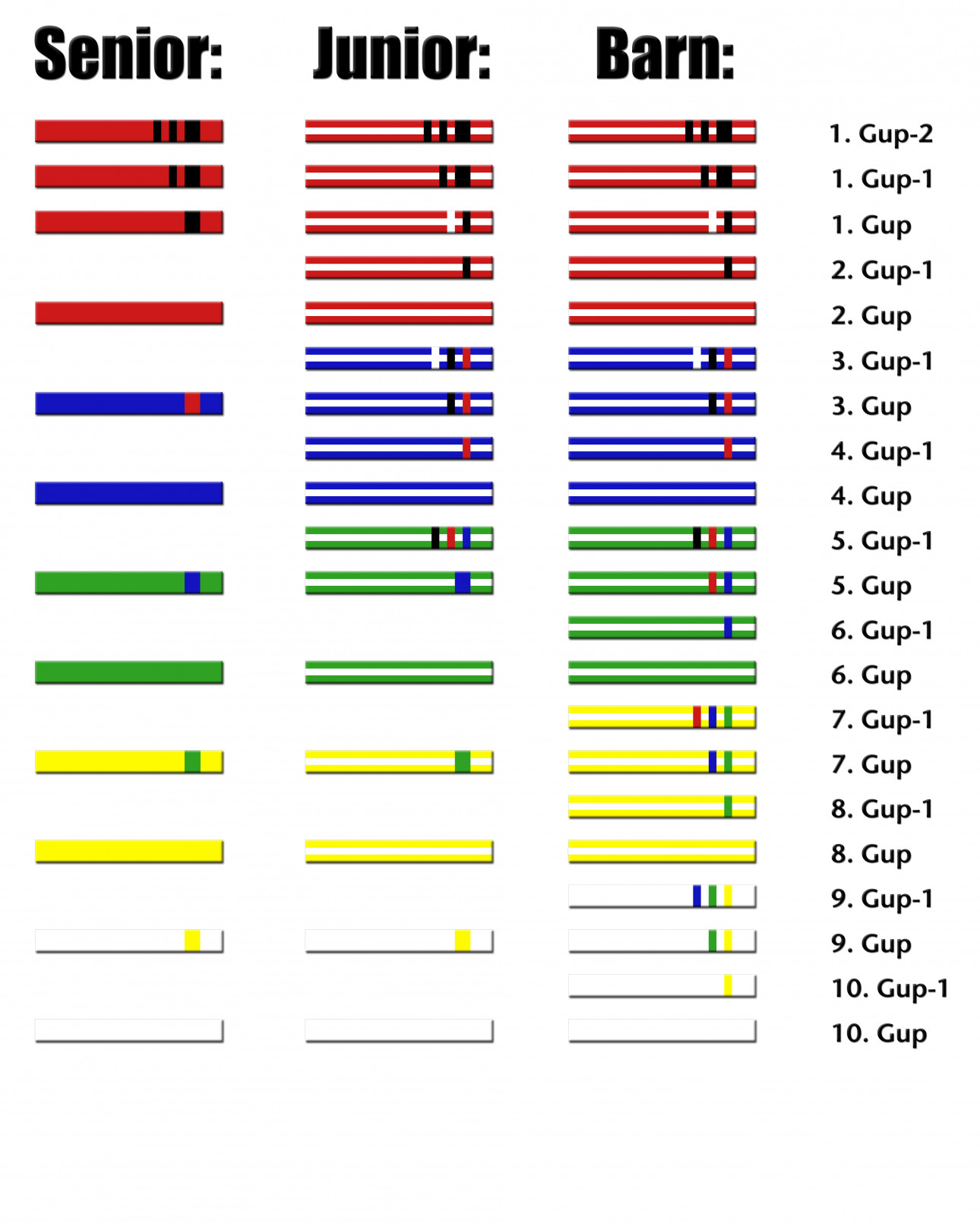 Man graderer seg til 1. Gup-2 på sommerleir. Man kan gradere seg til 1. Dan til jul, da man har hatt graden i ett treningssemester.